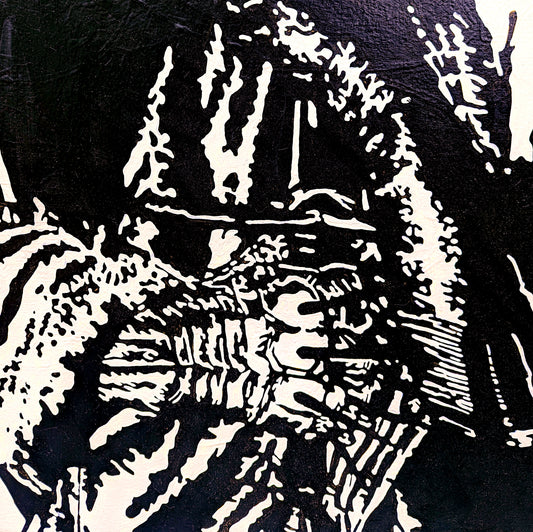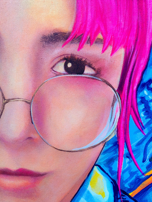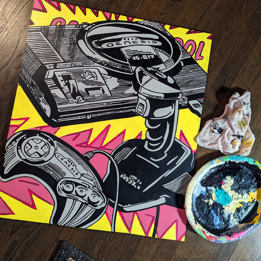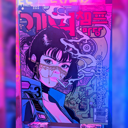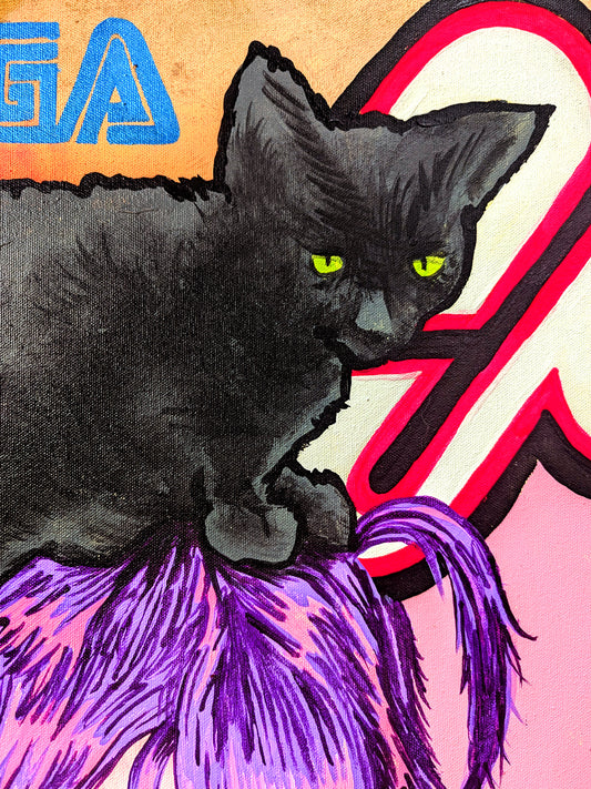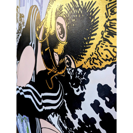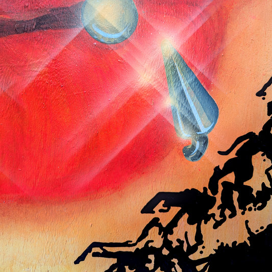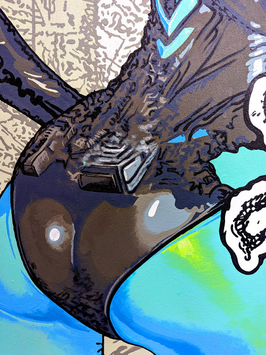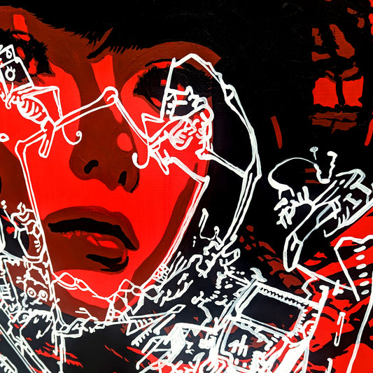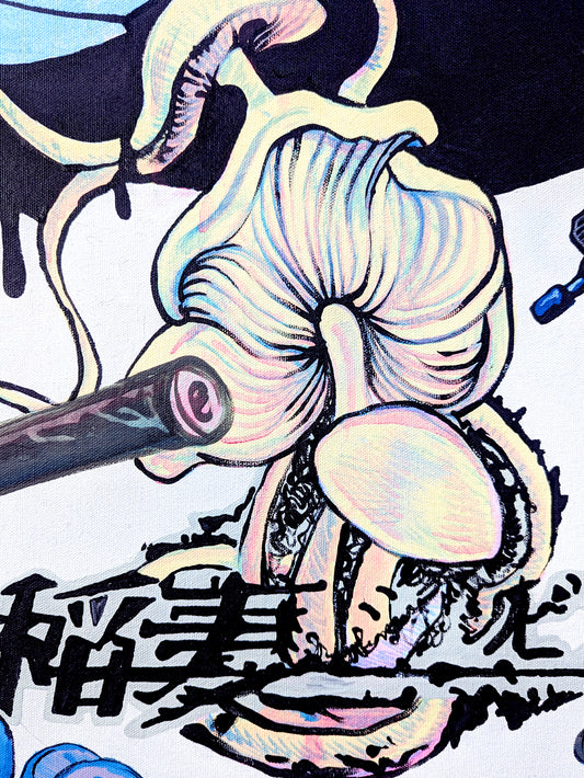… The walls are packed with paintings hung side by side and salon style, many of which are accompanied by a backstory allegedly written by the artworks themselves. From canvas to canvas, there is a consistent sentiment of nihilism that is communicated through haphazard references to violence and drugs. There is also a highly liberated application of languages and symbols that integrate as seamlessly here as they do in sci-fi movies like Blade Runner or The Fifth Element.