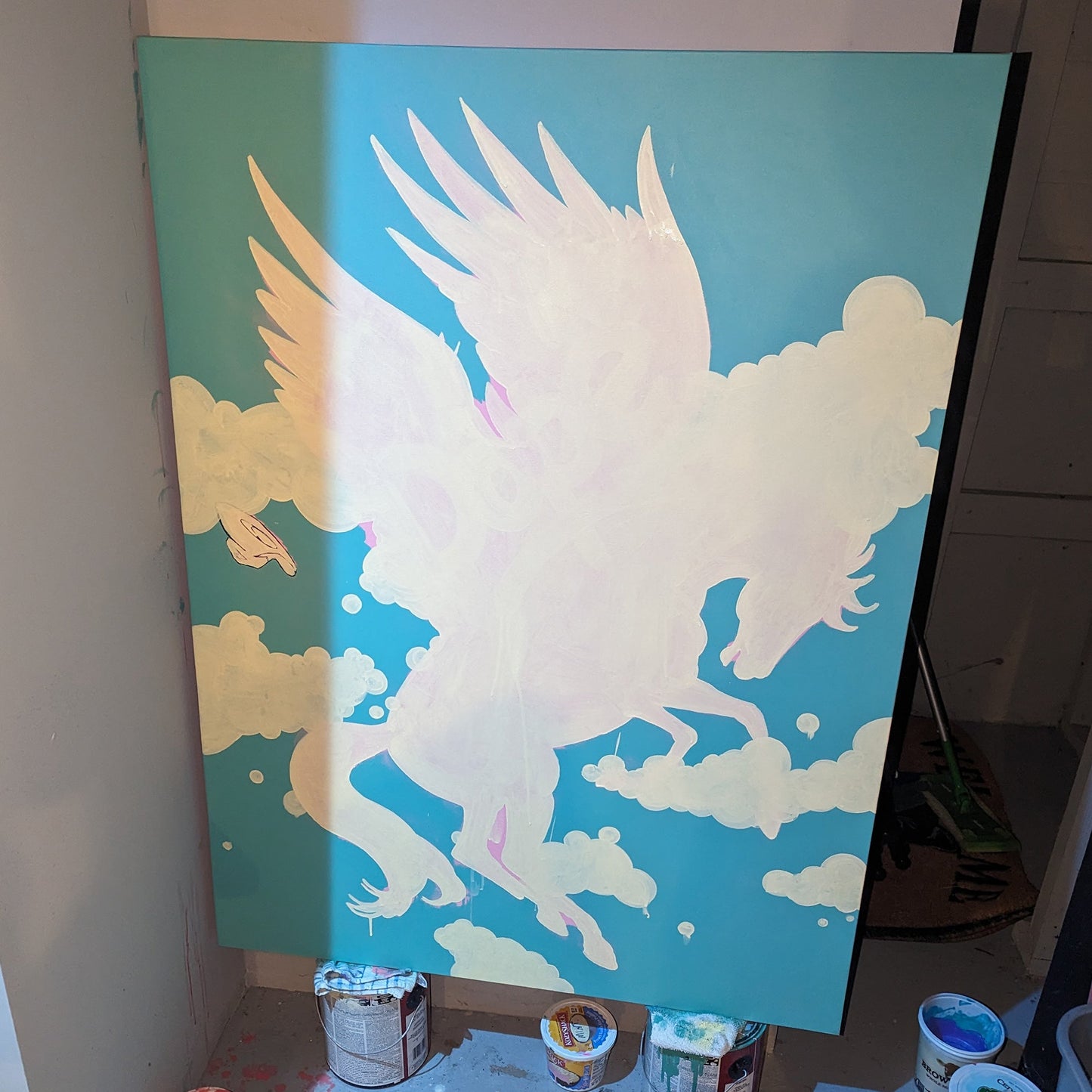 A winged horse, rendered in ethereal shades of lavender and pink, carries a slumped rider through an endless expanse of soft blue sky and cotton-like clouds. The horse’s majestic wings, poorly detailed with childish strokes, fail to evoke either freedom or fragility, as though they might dissolve into the canvas at any moment.