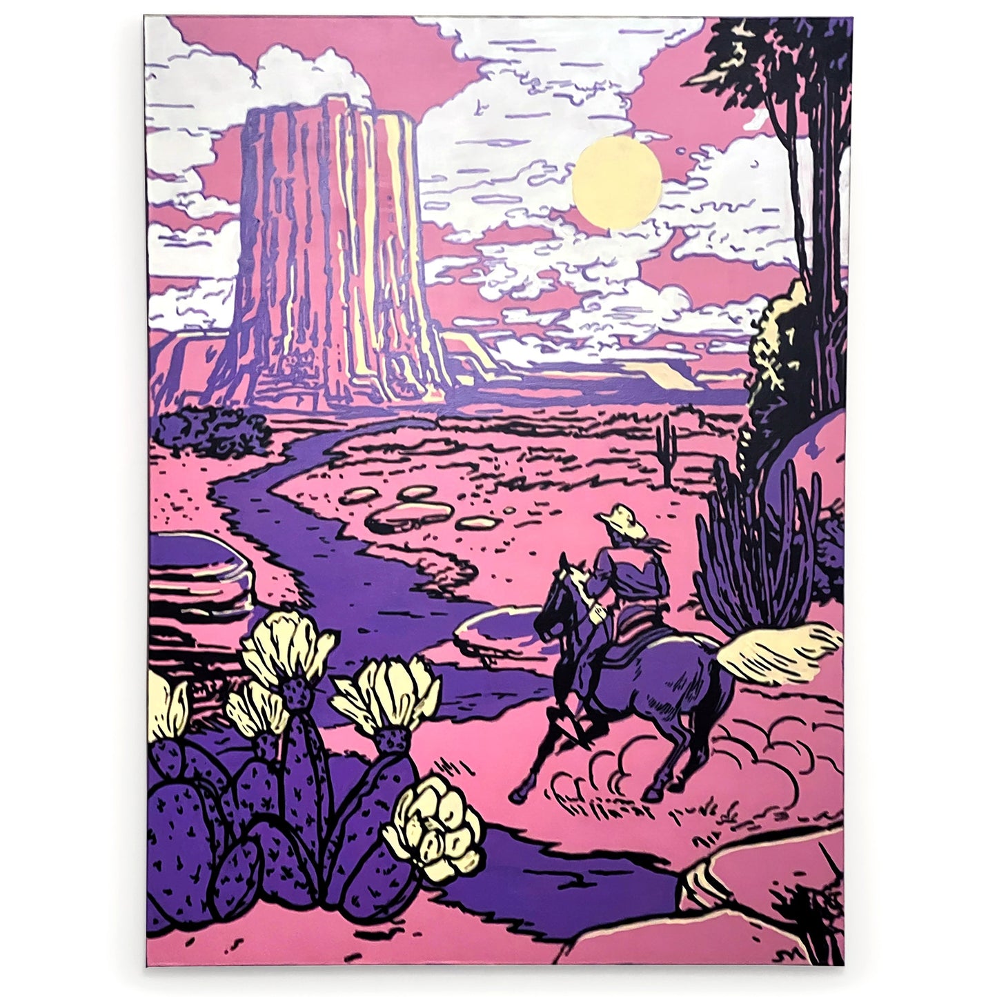 Presented in unexpected shades of pink and purple, this artwork offers a fresh perspective on the iconic cowboy narrative. The hints of ambiguity in time, as the celestial body could be either the sun or the moon, add a layer of intrigue to this larger-than-life depiction.