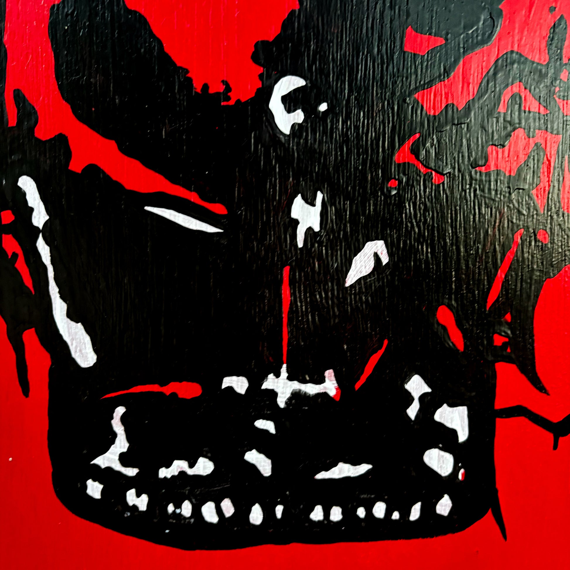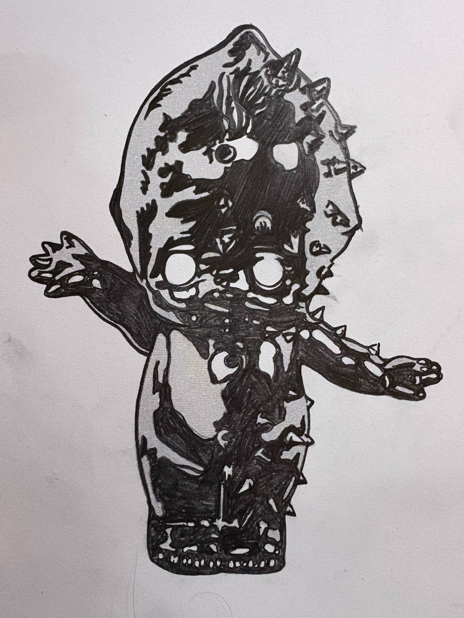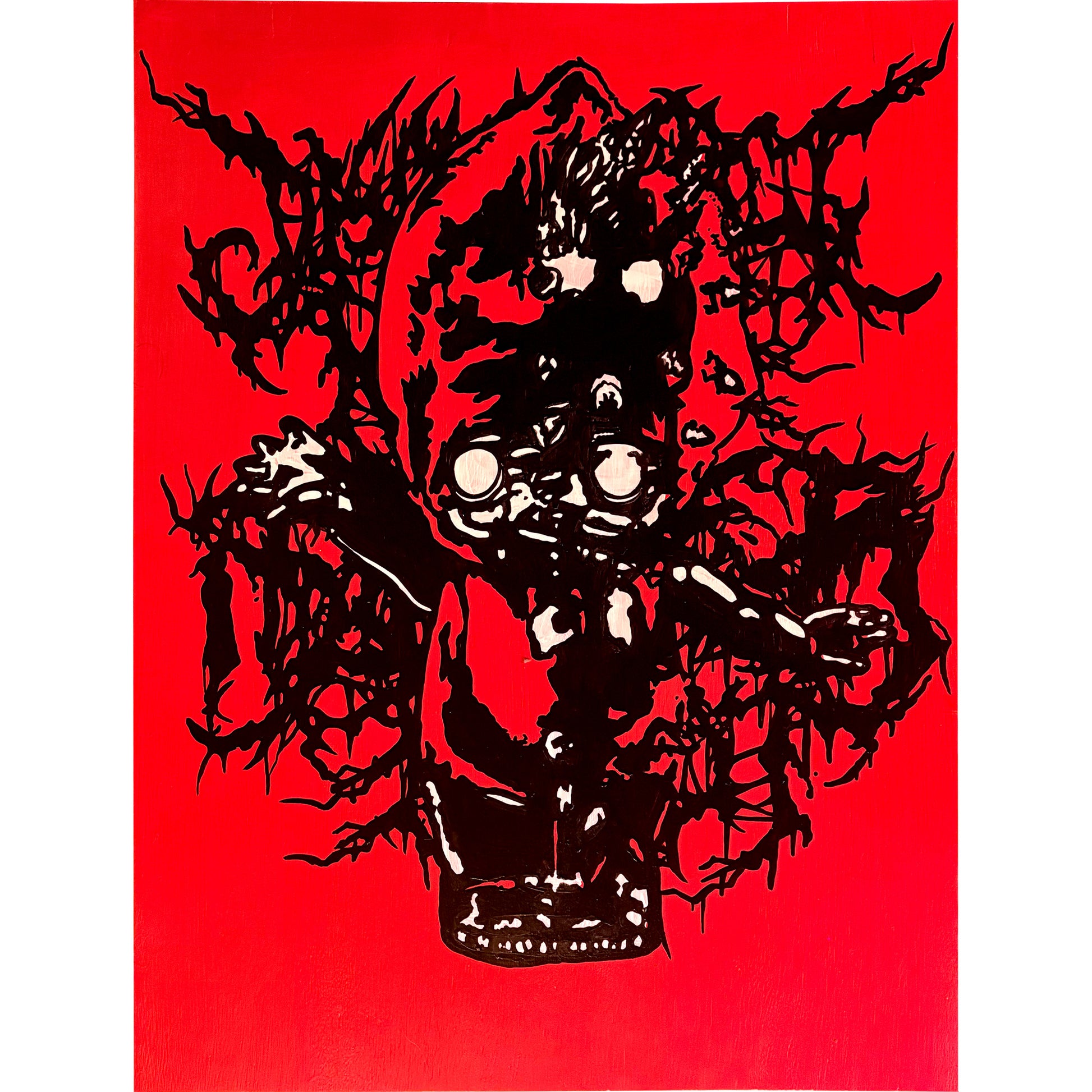 The image reads like a corrupted logo, a cute emblem dragged through hell and left humming with static. It feels both sacred and violent, an exorcism of childhood iconography rendered in the language of metal band logos and propaganda posters.
