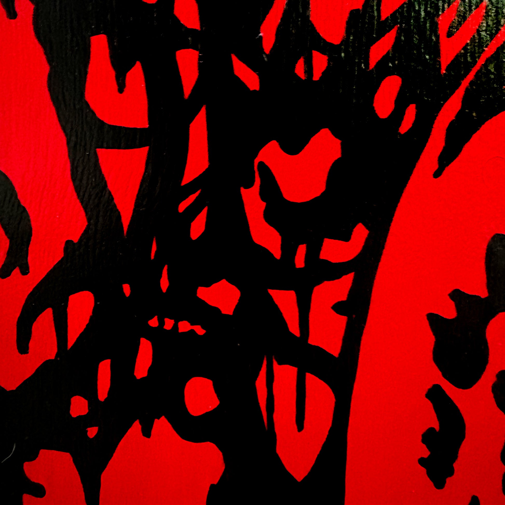 A distorted Kewpie doll stares out from a tangle of black mass, its outline consumed by a storm of thorns and calligraphic noise. The background bleeds pure red, swallowing the figure until only its eyes remain visible, wide and unblinking.
