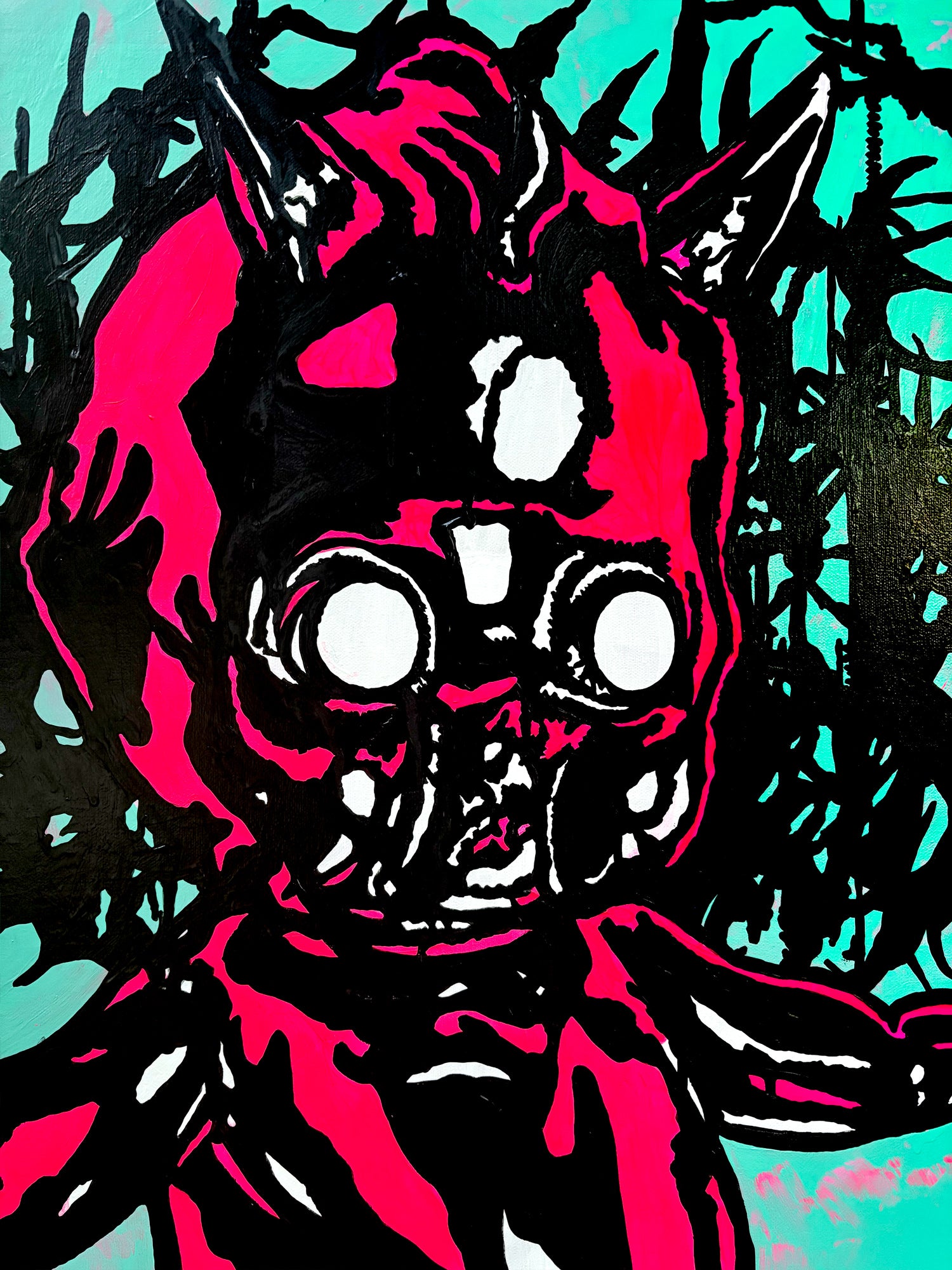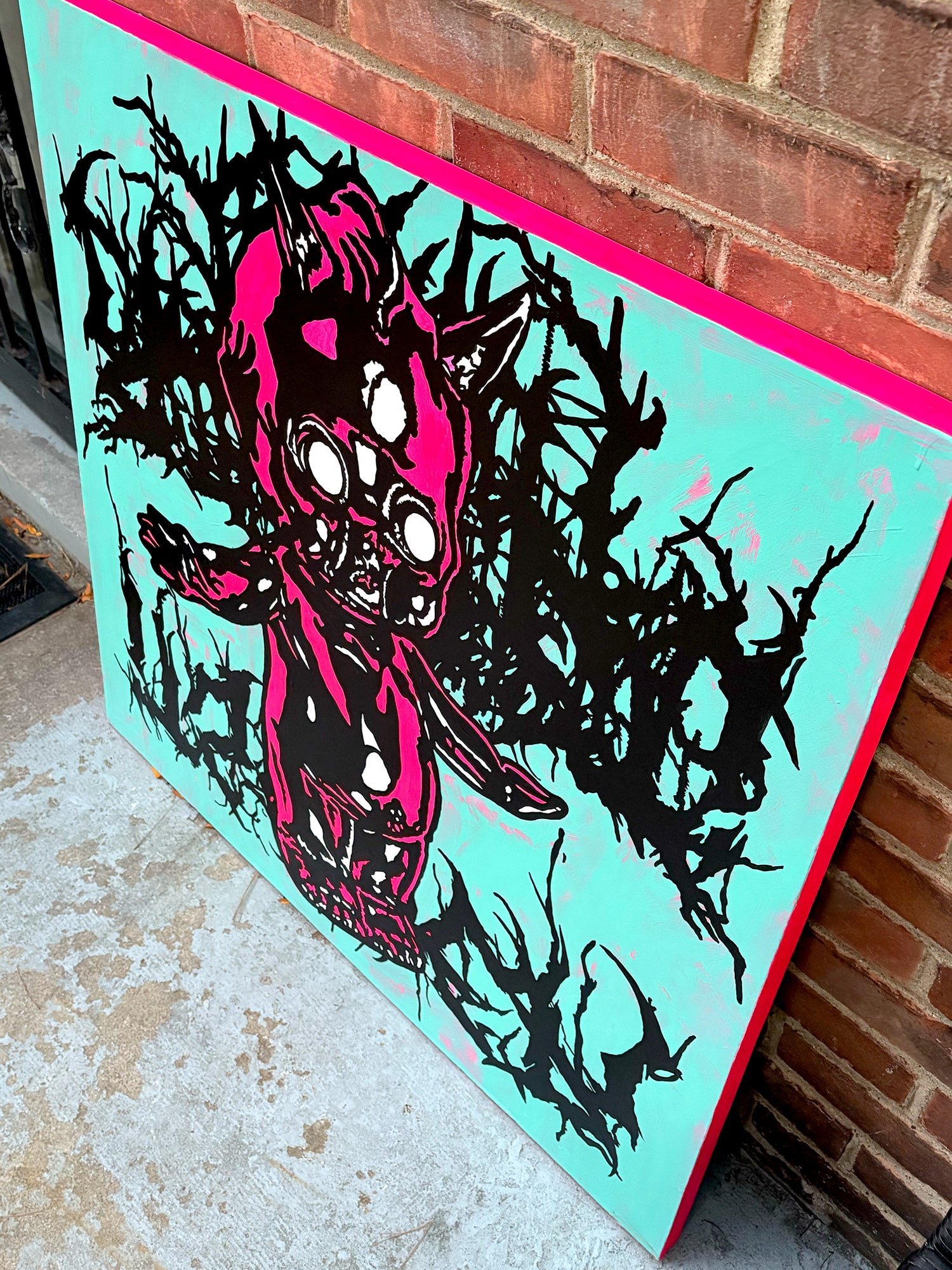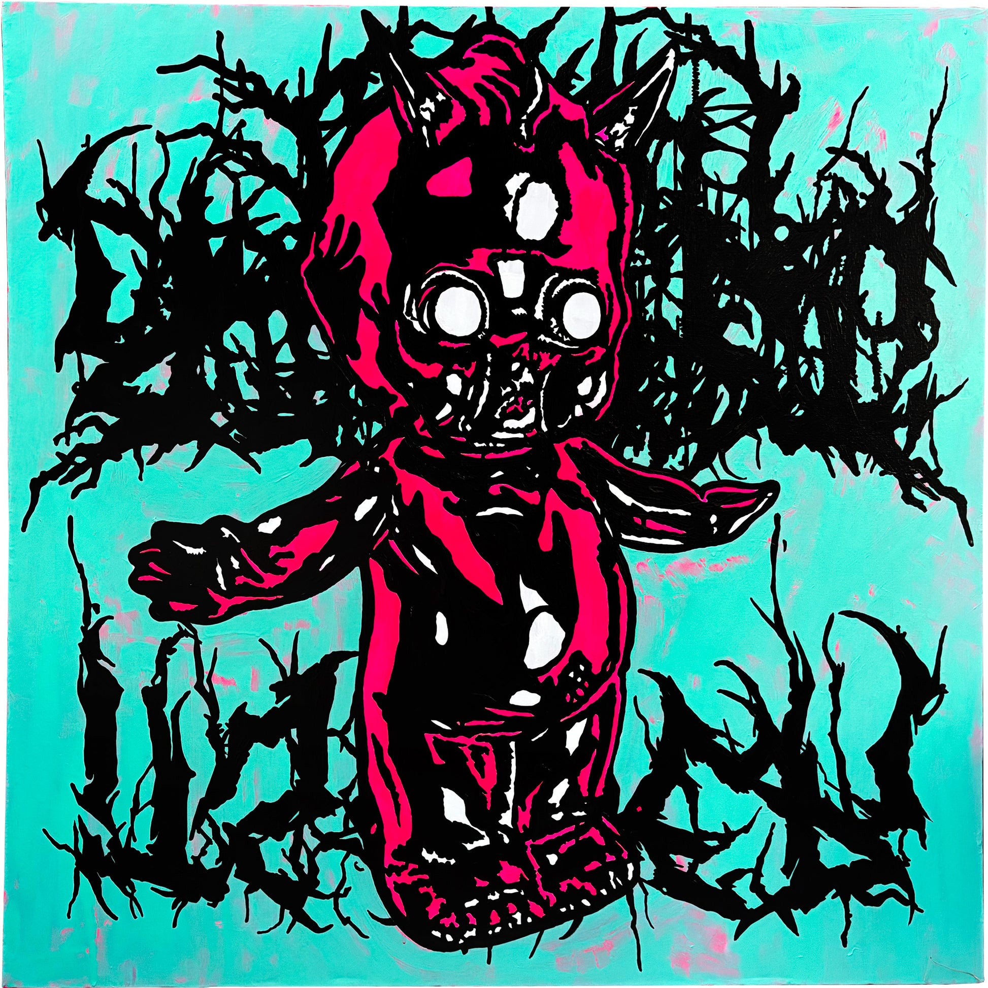A Kewpie doll rendered in toxic pink and black stands against a washed-out turquoise field, caught in a web of abstract lettering that looks halfway between graffiti and decay. The figure’s glassy eyes and small horns blur the line between innocence and possession, like a child’s toy resurrected as a cult idol.