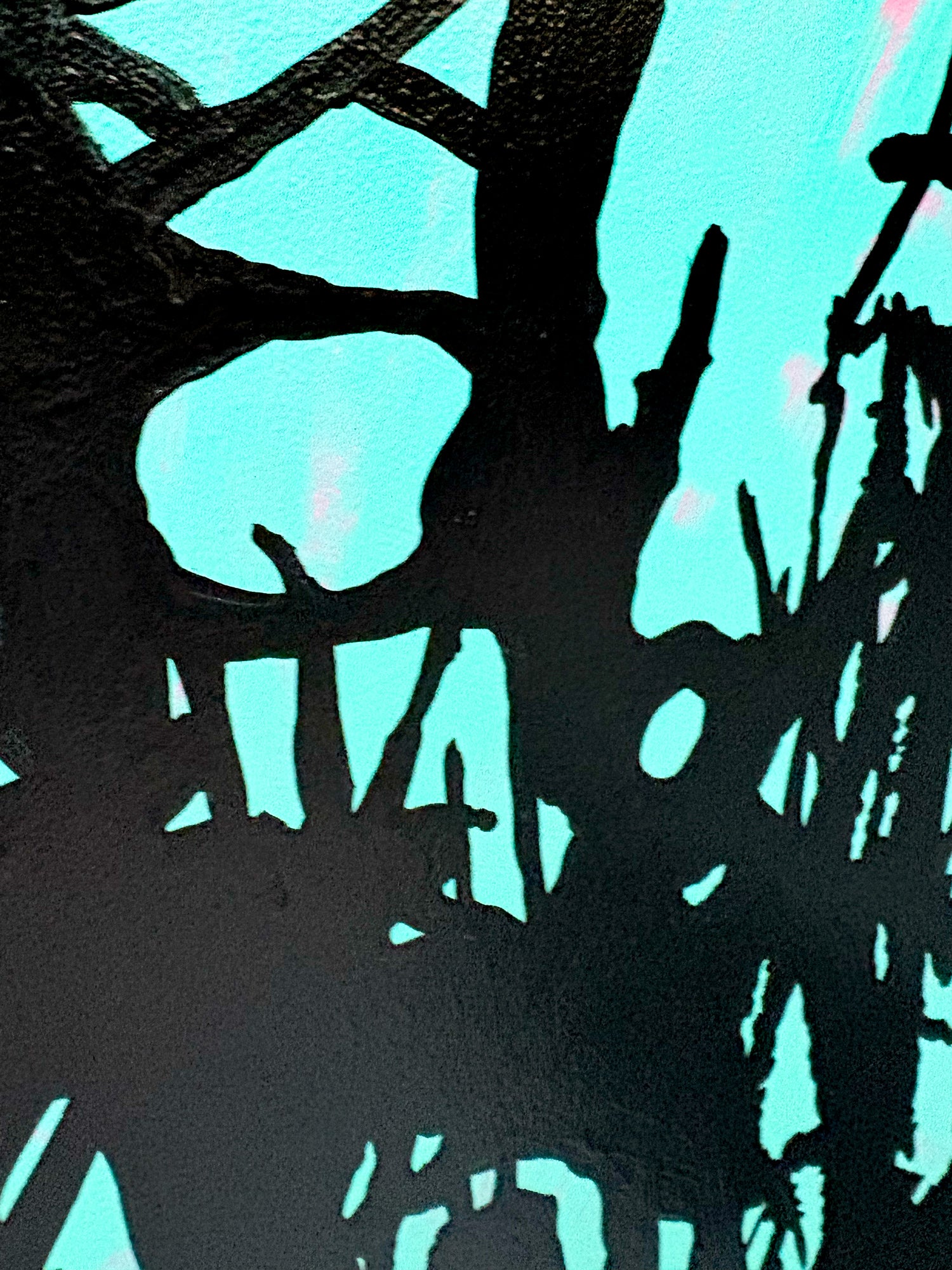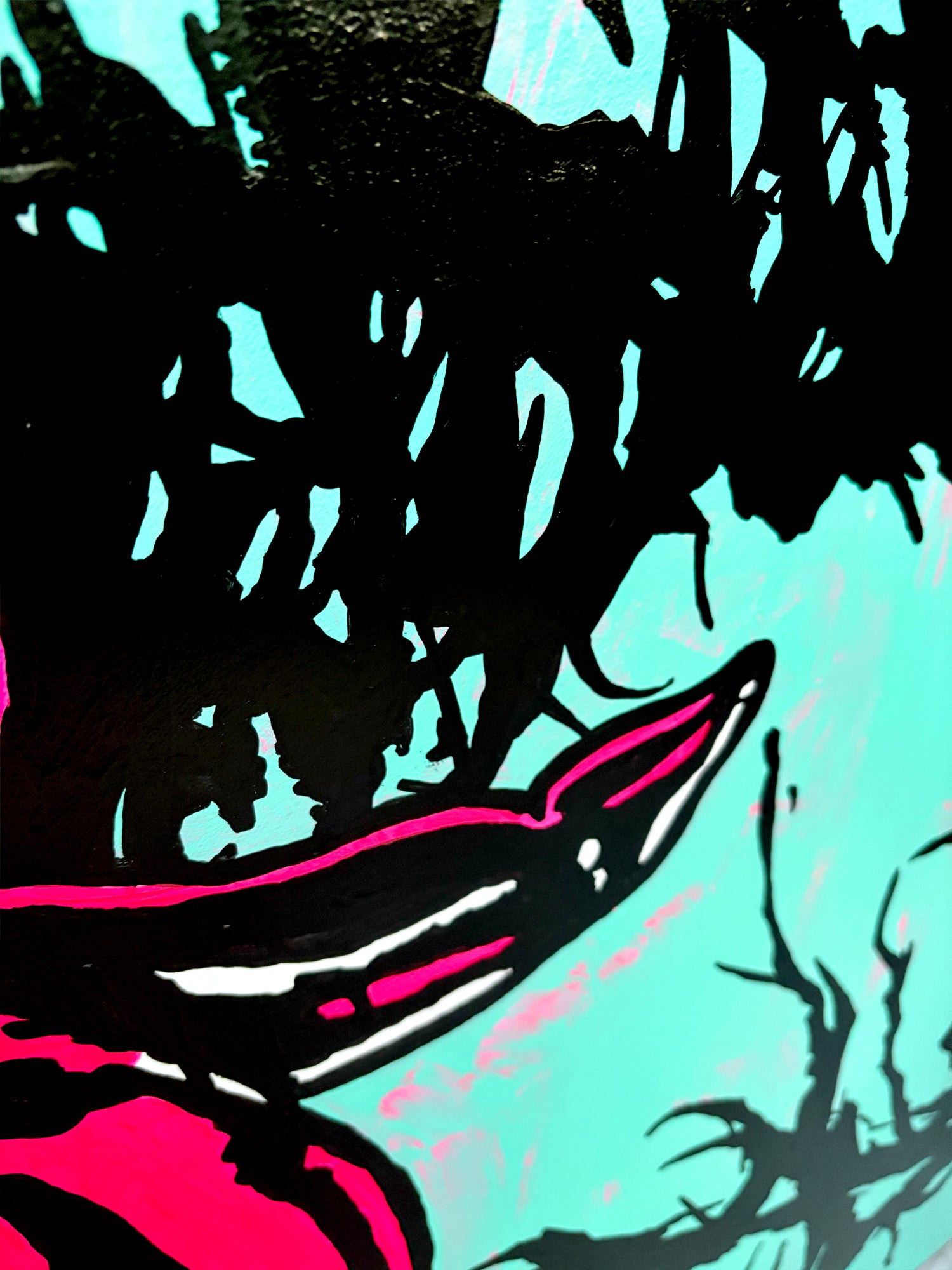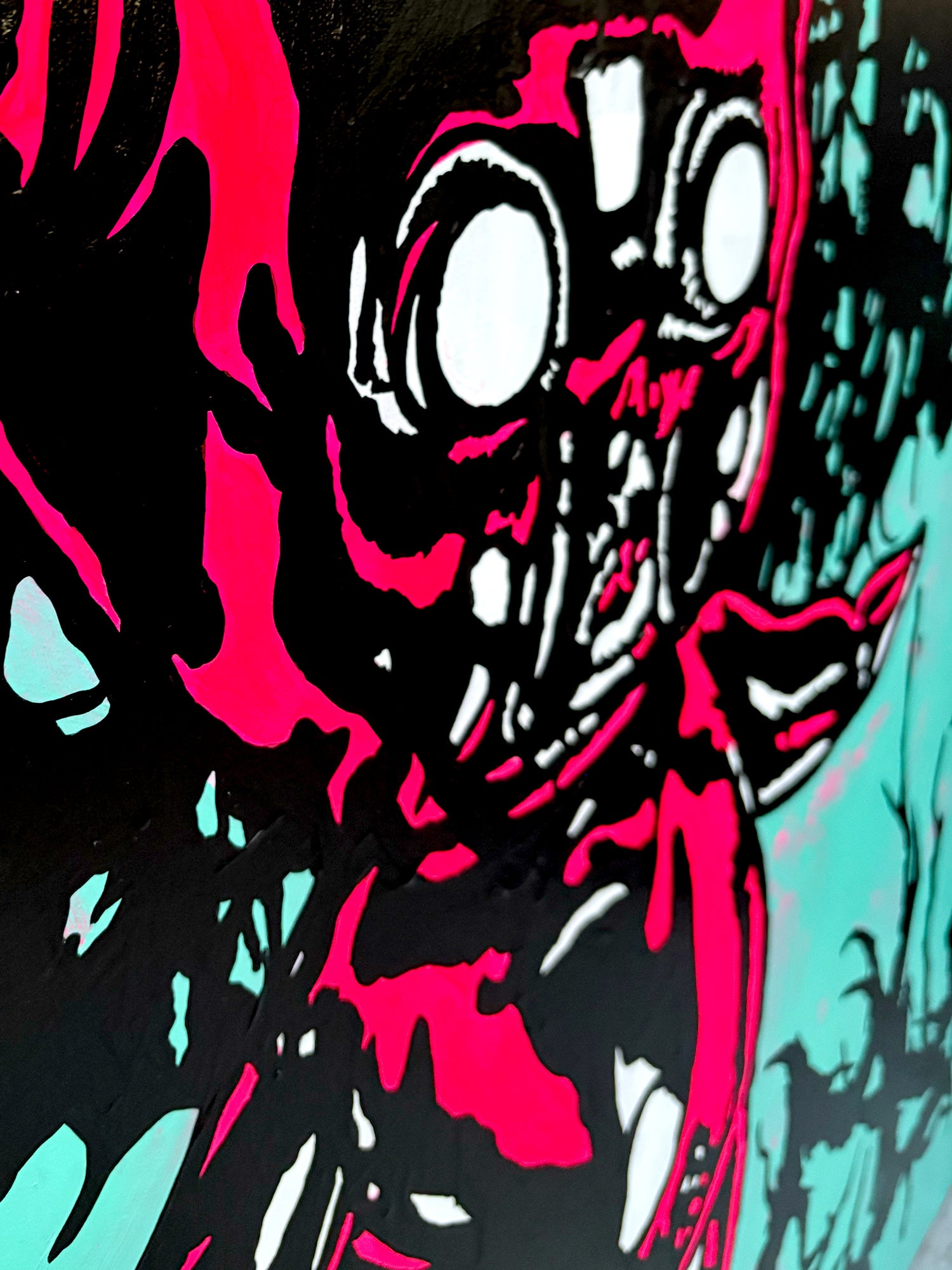 A Kewpie doll rendered in toxic pink and black stands against a washed-out turquoise field, caught in a web of abstract lettering that looks halfway between graffiti and decay. The figure’s glassy eyes and small horns blur the line between innocence and possession, like a child’s toy resurrected as a cult idol.