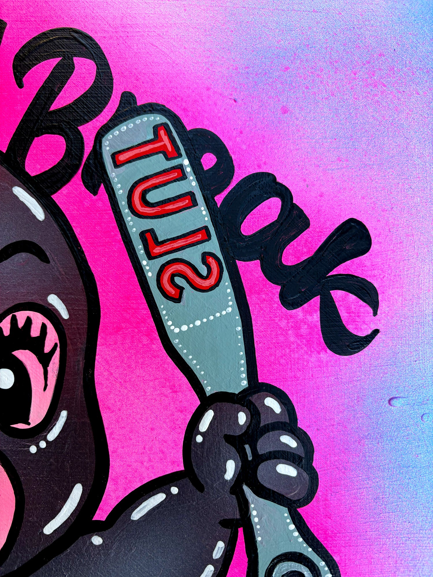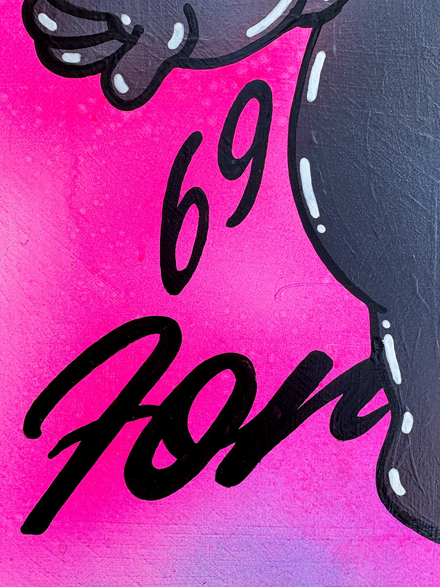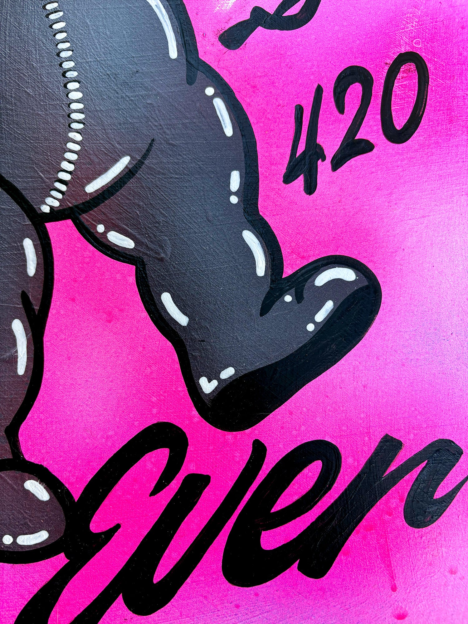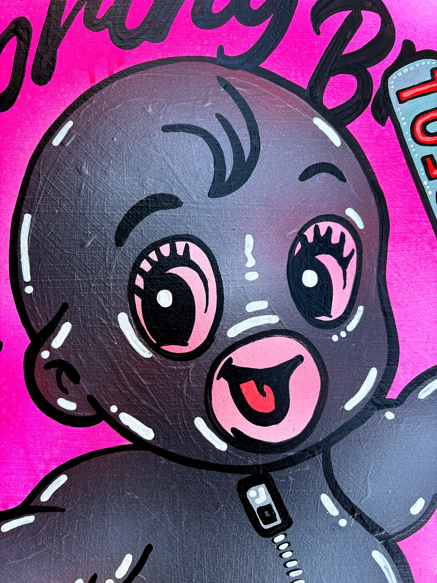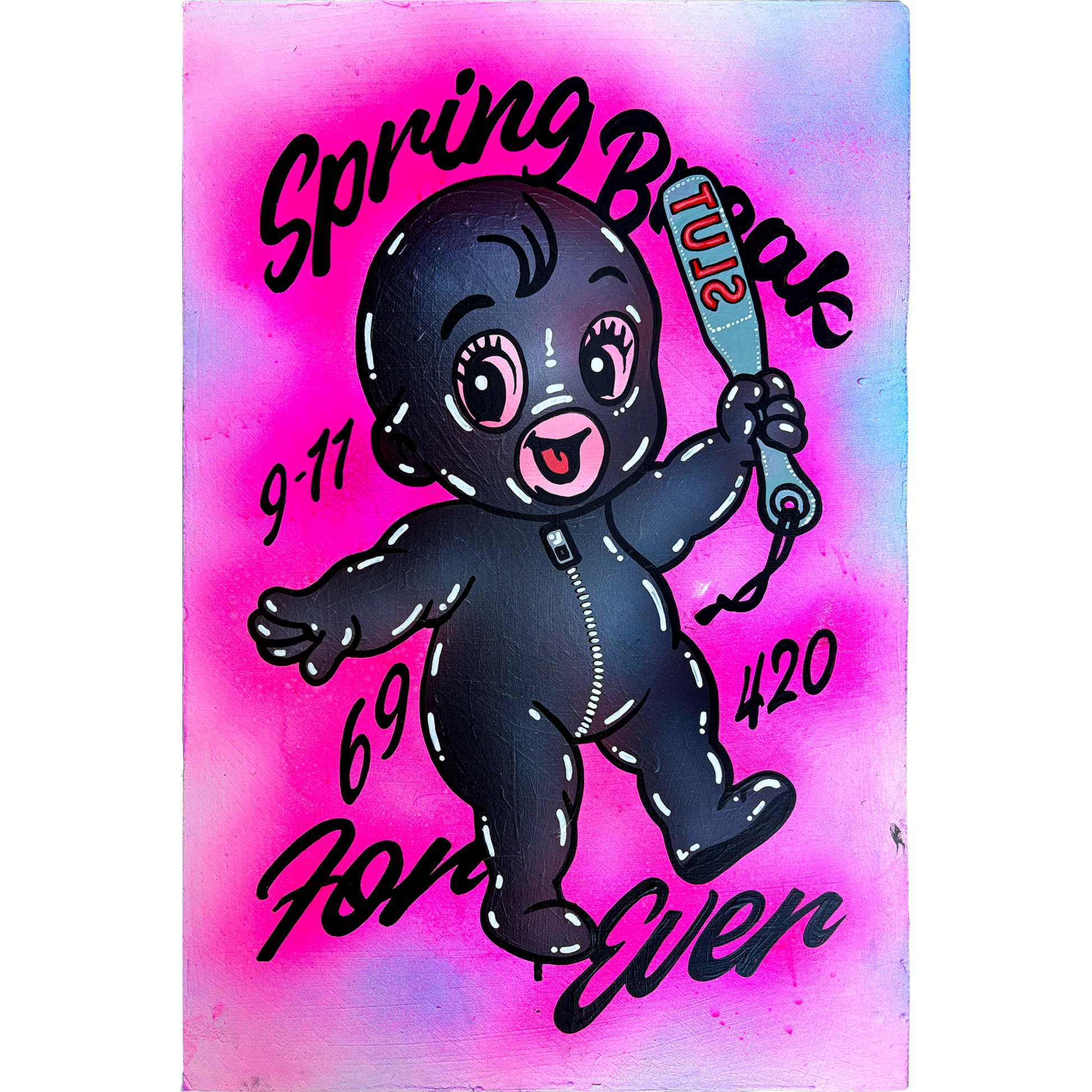 A baby doll in a black latex suit skips across a pink haze, clutching a provactive paddle. Around it, America’s favorite shorthand holidays orbit like sacred numbers. The text “Spring Break Forever” hangs overhead, transforming the kinky cherub into a mascot for endless vacation, a party that never ends even as the world burns. It’s innocence and obscenity zipped into the same costume, cartoon sweetness weaponized into something slick, branded, and grotesque.